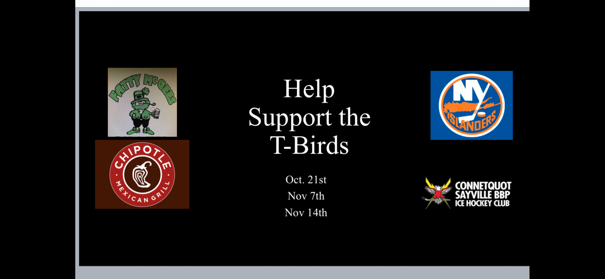 Nov. 14th at Chipotle in Bohemia from 4pm to 8pm, 33% of proceeds on meals with be donated to the T-Birds Hockey Program. Please visit Chipotle and invite friends and families to do the same.
